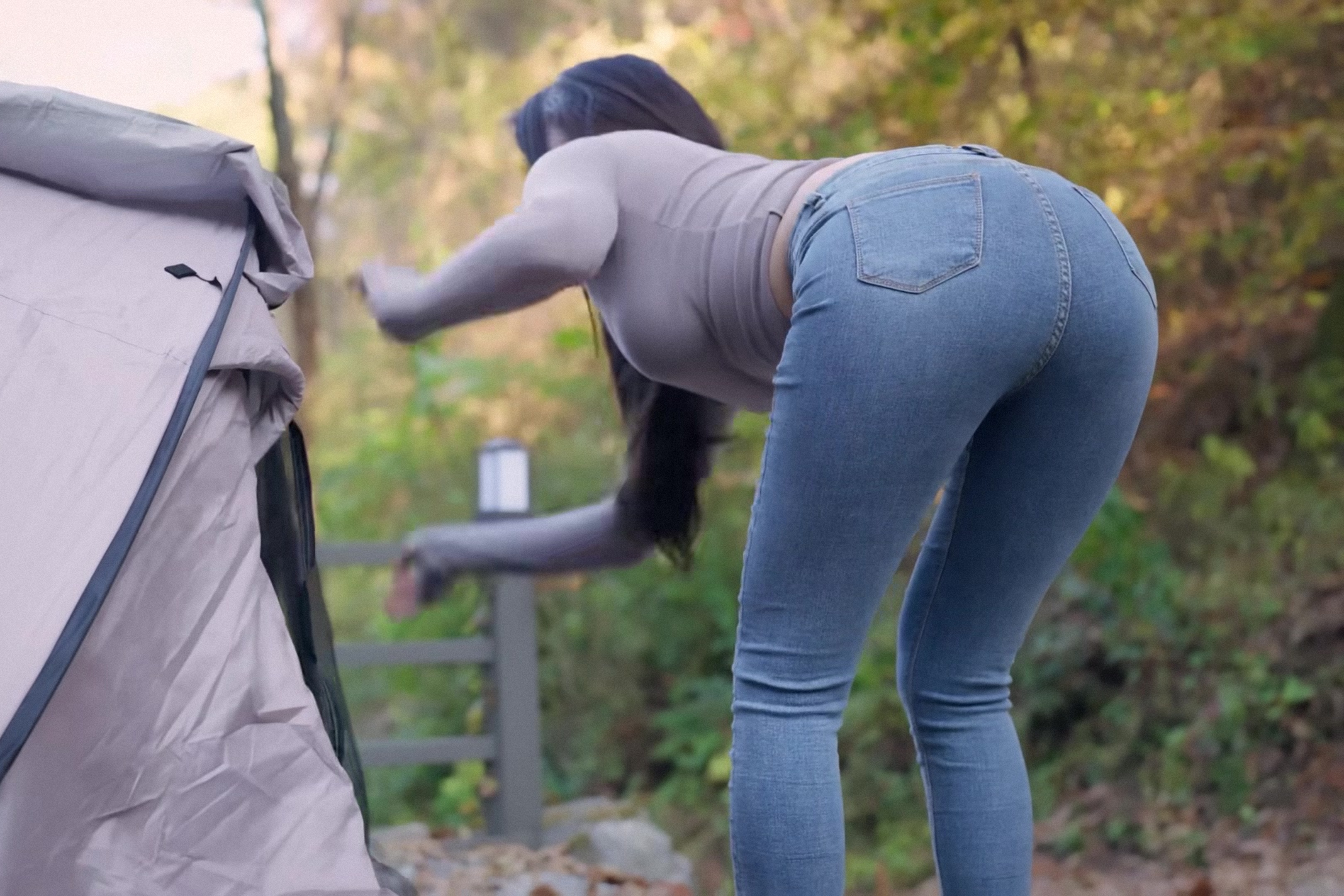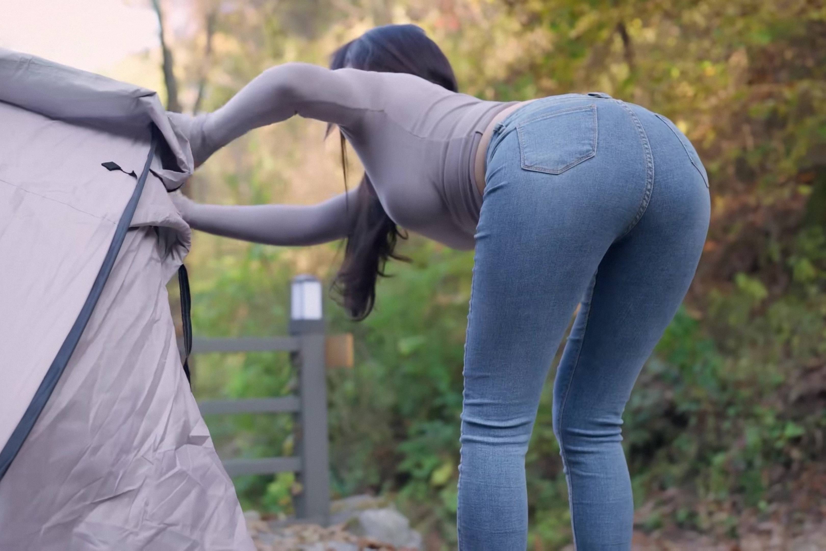 露营搭帐篷的紧身牛仔裤美女